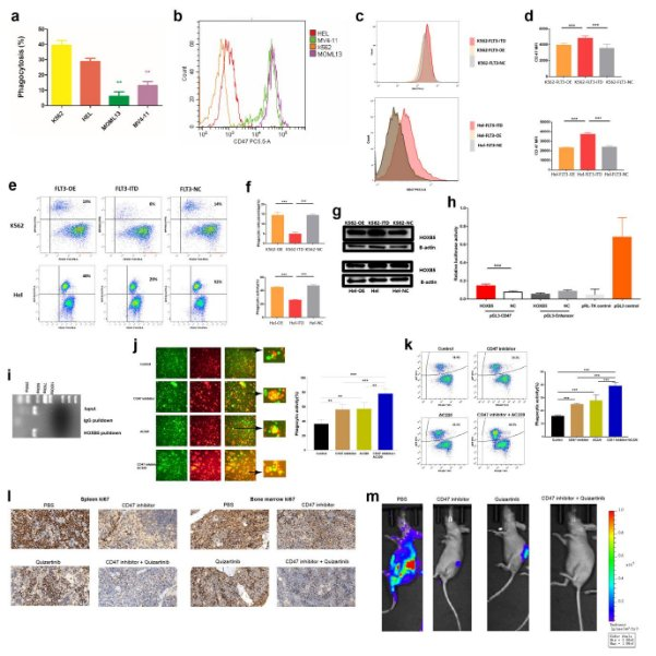 与FLT3-WT细胞系(K562, HEL)相比,FLT3-ITD细胞系(MOML13, MV4-11)诱导的巨噬细胞杀伤LDH较少(图a)。CD47的表达可以帮助肿瘤细胞免受巨噬细胞的攻击。FLT3-ITD组的CD47 MFI高于对照组(图b)。FLT3-ITD组的CD47 MFI显著高于FLT3-OE组和FLT3正常对照组(FLT3-NC)(图c-d)。流式细胞术结果显示FLT3-ITD损害了红色标记的巨噬细胞吞噬绿色标记的K652/HEL细胞的活性(图e-f)。使用TRANSFAC数据库,我们发现FLT3-ITD组的CD47基因相对表达显著高于其他组,并且HOXB5可能在转录水平上调节CD47的表达(图g)。Jasper在线工具的综合分析、双荧光素酶报告基因检测和ChIP实验表明HOXB5直接激活CD47(图h-i)。与对照组和两个单药治疗组相比,CD47抑制剂和FLT3-ITD抑制剂Quizartinib(AC220)的联合使用显著增强了巨噬细胞的吞噬活性(图j-k)。AML小鼠模型进一步显示,CD47抑制剂和Quizartinib的联合使用显著减少了脾脏和骨髓中的肿瘤负担(图l-m)。
