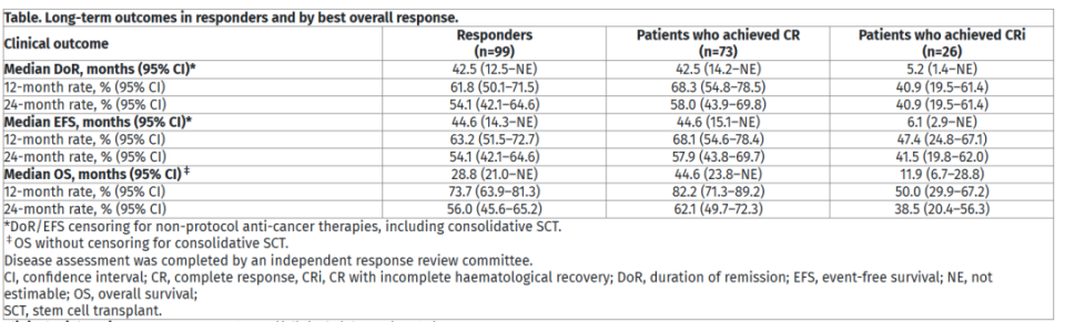 美国德克萨斯大学MD安德森癌症中心的Elias Jabbour展示了“FELIX研究中接受obe-cel治疗后获得缓解的成人R/R B-ALL患者的临床结局”(OS03-03)。该分析聚焦于CAR-T疗法obecabtagene autoleucel(obe-cel)在关键FELIX研究中获得缓解的患者的长期结局。在127例输注患者中,78%获得缓解,其中74例达到完全缓解,26例为血细胞计数不完全恢复的完全缓解。中位随访近33个月,缓解患者的中位缓解持续时间达44.6个月,中位总生存期为28.8个月。获得CR的患者预后显著优于CRi患者,其中位总生存期是后者的近4倍。尽管部分患者接受了巩固性干细胞移植,但相当大比例的患者(38.4%)在未接受其他抗癌治疗的情况下持续缓解。这表明obe-cel能为应答者带来持久的生存获益,而达到深度完全缓解是长期预后的关键。