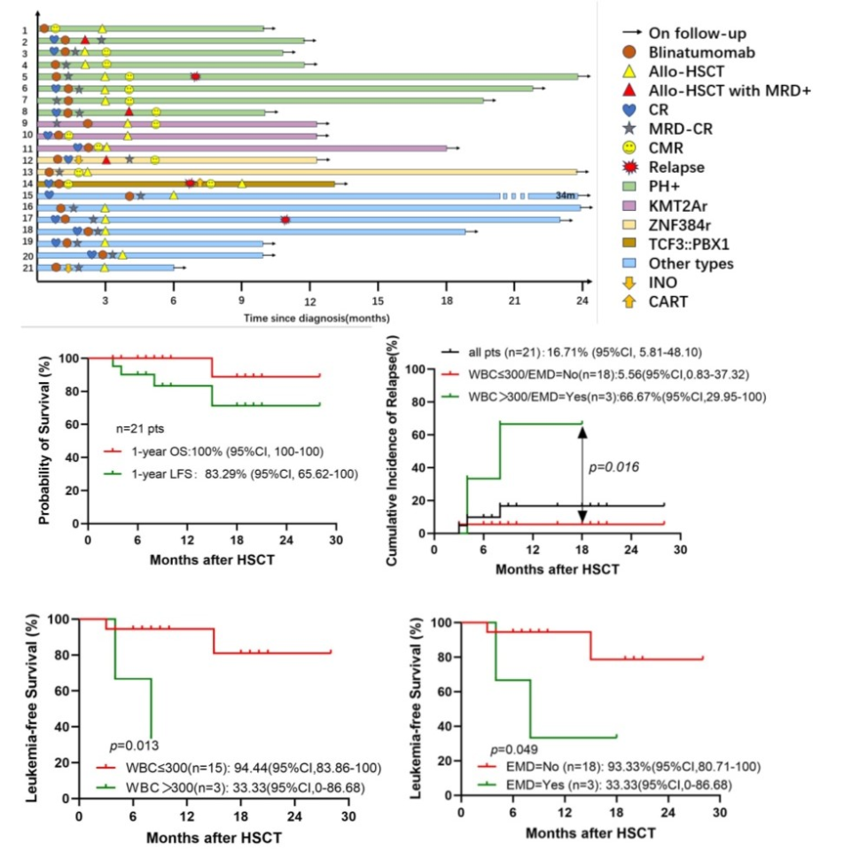 单因素分析显示诊断时候患者白细胞大于300 × 10⁹/L具有更低的LFS (P=0.013; 94.44% [95% CI: 83.86–100] vs. 33.33% [95% CI: 0–86.68])和更高的复发率 (P=0.016; 66.67% [95% CI: 29.95–100] vs. 5.56% [95% CI: 10–44.28])。同样,移植前有髓外病变(EMD)的患者LFS更低 (P=0.049; 93.33% [95% CI: 80.71–100] vs. 33.33% [95% CI: 0–86.68]) ,复发风险更高 (P=0.016; 66.67% [95% CI: 29.95–100] vs. 5.56% [95% CI: 10–44.28])。移植后有两例患者复发,中位时间6个月,包括一例中枢复发,一例眼睛复发。一例患者发生II度急性移植物抗宿主病(aGVHD),一例发生中度慢性GVHD。13例患者移植后接受了维持治疗,包括12例口服靶向药,1例进行小剂量BLIN维持治疗。