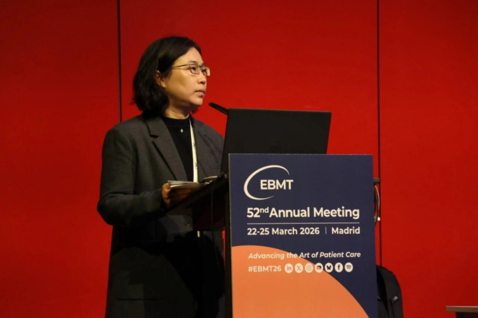 当地时间2026年3月22日至25日,第52届欧洲血液和骨髓移植学会(EBMT)年会在西班牙马德里召开。本届年会吸引了来自全球95个国家的5600余名与会者参加,围绕造血干细胞移植及细胞治疗领域的最新基础研究、临床实践和创新技术展开深入探讨。本届年会中,黄河教授带领的浙大一院骨髓移植中心团队不仅展示了在造血干细胞移植底层逻辑(供者选择、并发症防治、MRD监测)上的深厚功底,更凸显了在细胞治疗前沿(体内CAR-T、双靶点自身免疫病治疗、超低剂量疗法)的全球领先地位入选了1项大会主旨报告,2项特邀报告,6项口头(ORAL)报告。此外,浙一骨髓移植团队青年学者梯队崛起,21项壁报展示全面开花,且斩获“最佳青年摘要奖”和“最佳基础科学海报奖”,彰显了中心深厚的人才储备,赢得了各国专家同行的高度评价。