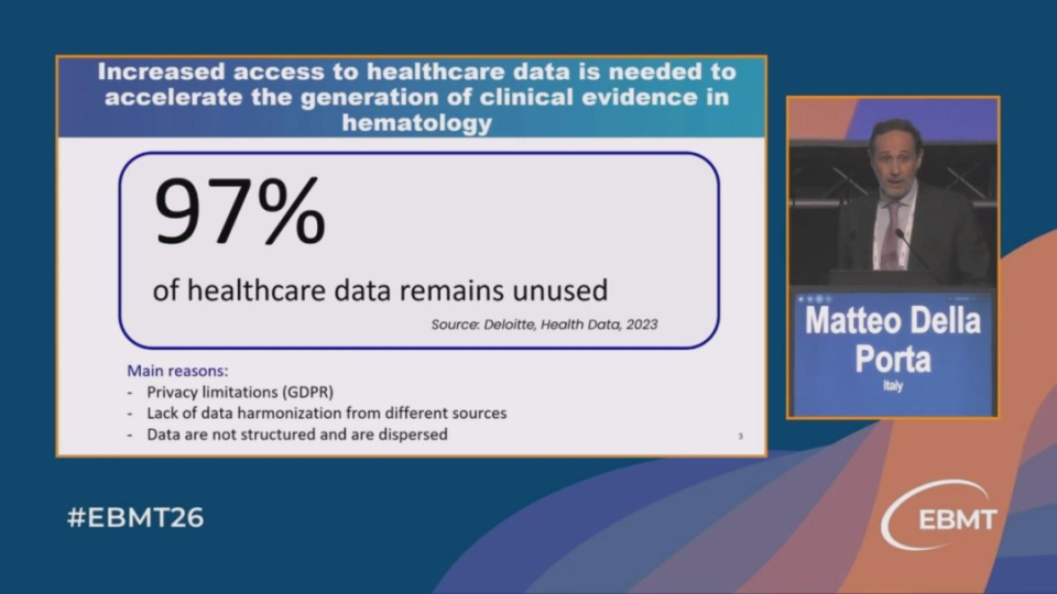 米兰Humanitas研究医院的Matteo Della Porta博士聚焦于如何利用AI技术生成“合成数据”,以解决临床研究中高质量真实世界数据稀缺与隐私受限的矛盾。合成数据是通过算法学习真实数据集的统计与临床特征后生成的人造数据,因其不对应真实患者,可规避隐私法规限制,从而实现自由共享与分析。