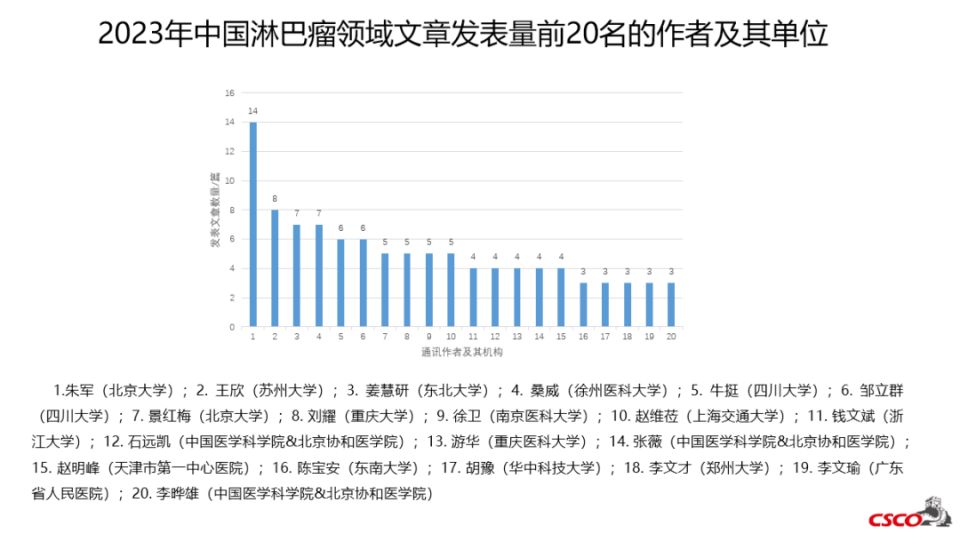 CSCO淋巴瘤学组对2023年领域内中外文献进行了系统检索,并且对2023年中国淋巴瘤领域文章发表量前20名的作者以及研究机构进行了梳理。以下选择其中部分研究进展进行介绍。