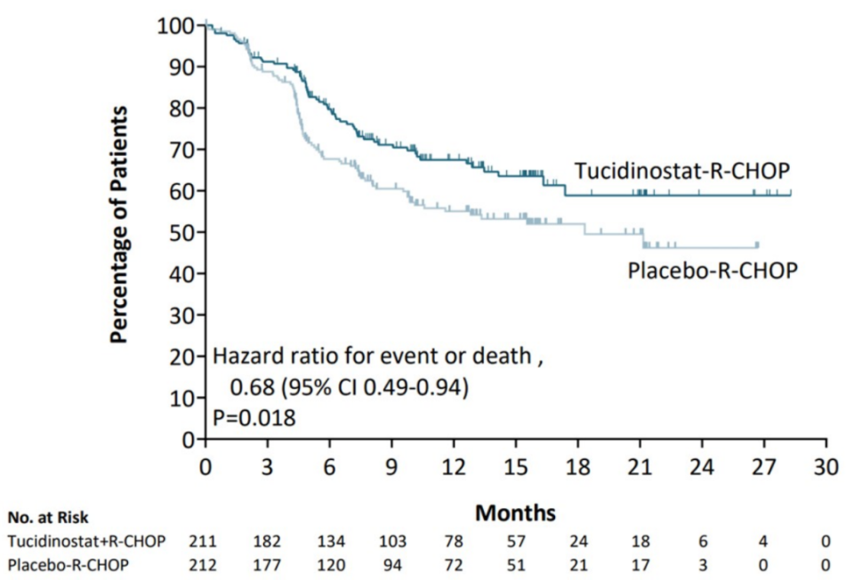 2024 ASCO大会公布了DEB研究的中期分析结果[1],该研究是由上海交通大学医学院附属瑞金医院赵维莅教授及其团队开展,它是一项多中心、随机、双盲、安慰剂对照、III期试验,旨在探讨西达本胺加R-CHOP治疗MYC和BCL2双重表达的既往未经治疗的弥漫性大B细胞淋巴瘤(DLBCL)的疗效和安全性。截至本中期分析的数据截止日期(2023年1月10日),中位随访时间为13.9个月(95%CI:12.9~15.4)。结果显示,西达本胺组的24个月无事件生存(EFS)率为58.9%(95%CI:48.9~67.6),安慰剂组为46.2%(95%CI:35.7~56.1)。两组之间的风险比(HR)为0.68(95%CI:0.49~0.94),P值为0.018。联合治疗完成时,西达本胺组和安慰剂组的完全缓解(CR)率分别为73.0%(95%CI:66.6~78.5)和61.8%(95%CI:55.1~68.1)。CR的校正差异为11.1%(95%CI:2.3~20.0;P=0.014)。两组的安全性特征符合预期,无新的安全性发现。西达本胺组≥3级血液学不良事件的发生率通常高于安慰剂组,但大多数患者能够耐受并完成计划的治疗周期。两组均未见明显心脏毒性、肝毒性、肾毒性。该研究表明,西达本胺加R-CHOP可能是该患者人群的一种新的一线治疗选择。