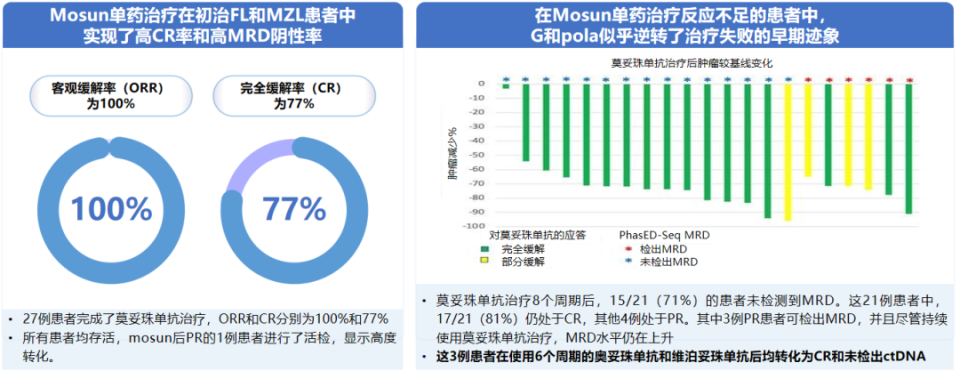 2024 EHA大会公布了莫妥珠单抗(MOSUNETUZUMAB)联合或不联合奥妥珠单抗和Pola治疗滤泡性淋巴瘤(FL)或边缘区淋巴瘤(MZL)的疗效调整治疗研究中期结果[6]。研究纳入了在2022年3月24日至2024年1月25日期间的35例患者,其中35例患者可进行安全性评价,31例患者可进行有效性评价。结果显示,25例(66%)患者发生1级细胞因子释放综合征(CRS),未观察到≥2级的CRS和任何级别免疫效应细胞相关神经毒性综合征(ICANS)。27例患者完成了莫妥珠单抗治疗,ORR和CR率分别为100%和77%。莫妥珠单抗治疗8个周期后,15/21(71%)的患者未检测到MRD。