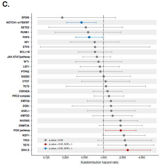 本研究使用惩罚回归模型,在 Fine 和 Gray 模型中检验了 NGS 面板 72 个基因中超过 2% 的患者的 39 个基因突变对复发风险的影响。结果表明,N/F、PHF6和EP300改变与良好的预后相关。相反,N-K-RAS、PI3K通路、TP53、IDH1/2、IKZF1和DNMT3A突变与较高的复发风险显著相关。