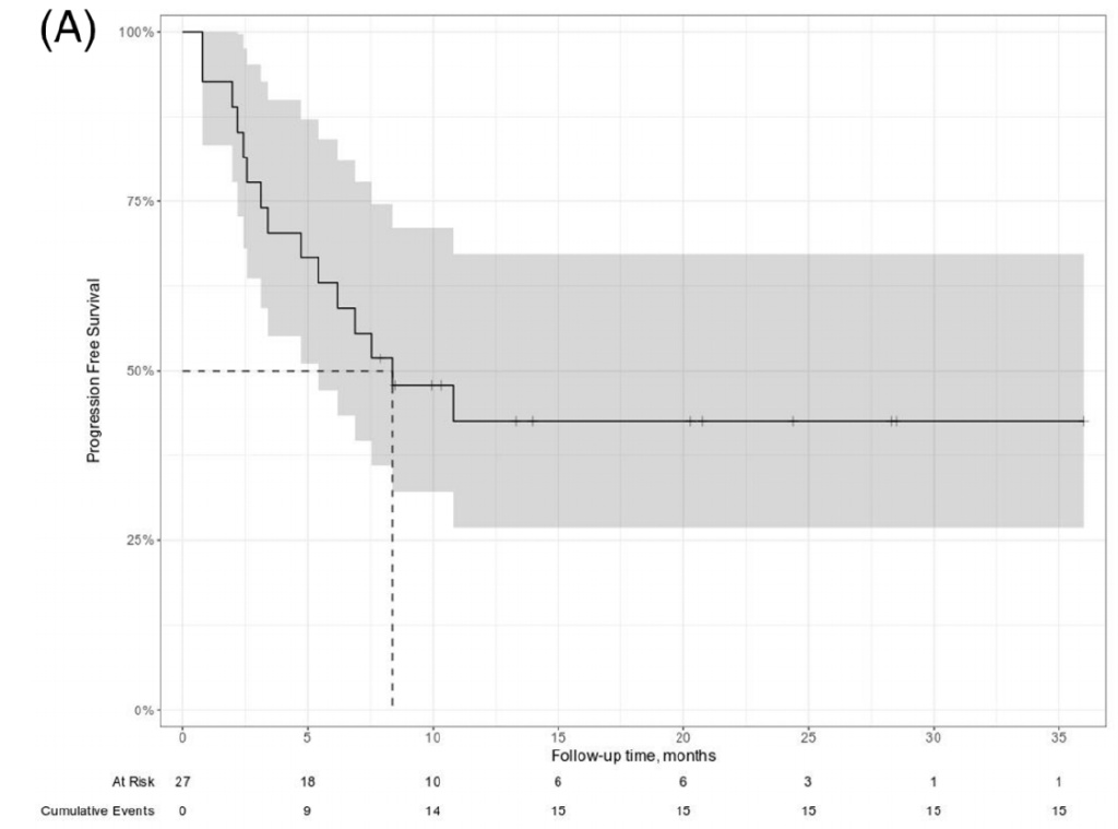 该研究纳入27例r/r-PCNSL患者,其中25例患者最终接受了CAR-T治疗,中位年龄68岁,既往平均接受了3线治疗(其中14例接受过ASCT,2例接受了全脑照射治疗),22例(81%)出现脑实质受累,8例(30%)存在脑脊液受累,仅有1例患者未接受桥接治疗。