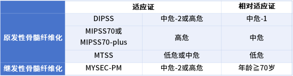 异基因移植适应证详见表1。此外,患者意愿、疾病特点(如TP53突变)以及患者特点(体能状态、同胞相合供者)也是需要考虑的状态。移植时机方面,根据最新EBMT和欧洲白血病网络(ELN)推荐,高危及中危-2应立即移植,中危-1可择期移植;接受芦可替尼治疗的患者需要及时评估疗效,6个月的治疗反应(RR6)高危组患者需要移植。