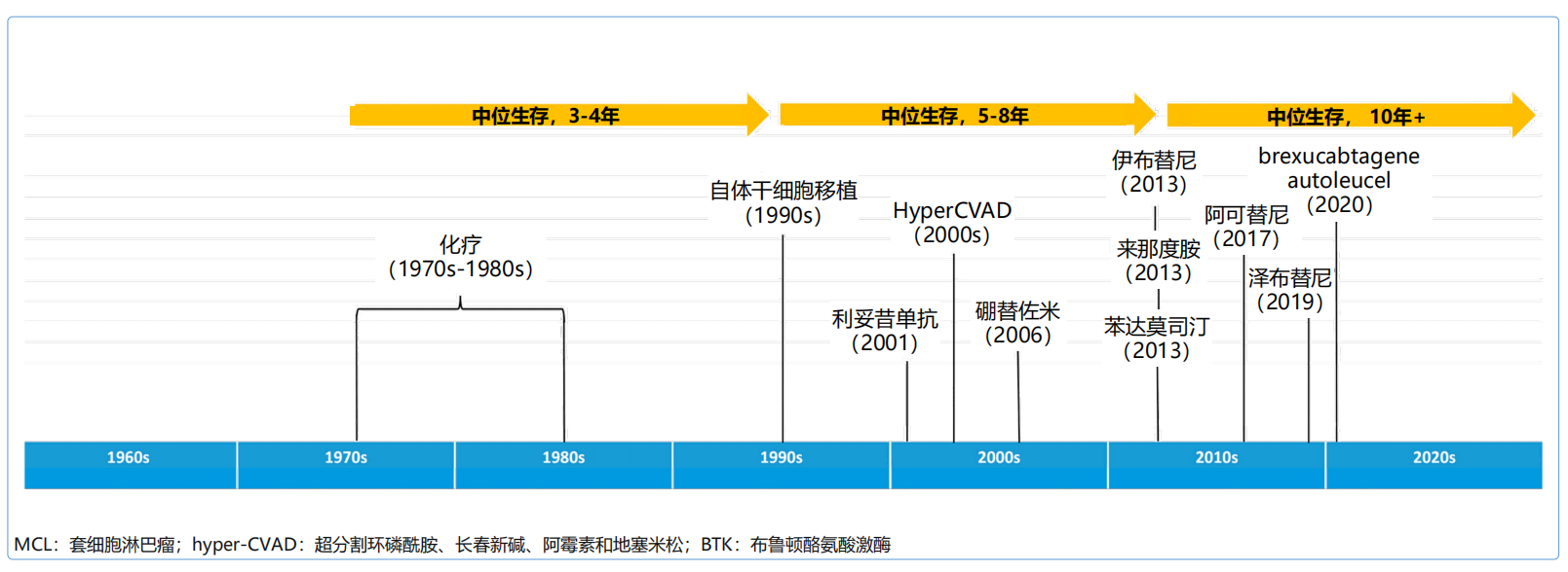 MCL的治疗经历化疗、自体干细胞移植以及新药等不同阶段。自1991年自体干细胞移植被应用于MCL的治疗后,患者预后显著改善,中位生存期从3~4年提升至5~8年;2010年后,越来越多的新药包括蛋白酶体抑制剂、免疫调节剂、布鲁顿酪氨酸激酶(BTK)抑制剂等被应用于MCL的治疗,使患者中位生存进一步提升,然而MCL仍无法治愈。