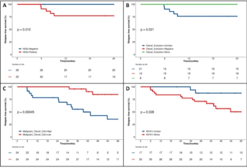 A:诱导治疗后NGS MRD的RFS;B:诱导治疗后克隆演化的RFS;C:治疗前按恶性克隆细胞比例计算的RFS;D:恶性克隆中IGHV1表达的RFS。
