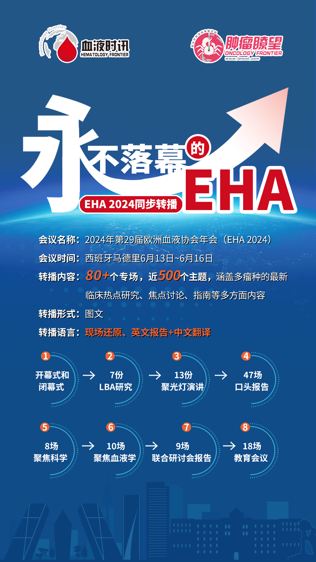 2024年欧洲血液协会年会(EHA 2024)如期而至。为了持续分享和探讨血液学领域的最新研究成果和诊疗经验,《肿瘤瞭望——血液时讯》特别推出“永不落幕的EHA ”专栏,专栏将涵盖从恶性血液病到非恶性血液病的最新研究,从精准医疗到细胞疗法的创新等多个领域,旨在为广大血液学专家和医生提供最前沿的学术信息和实践指导。