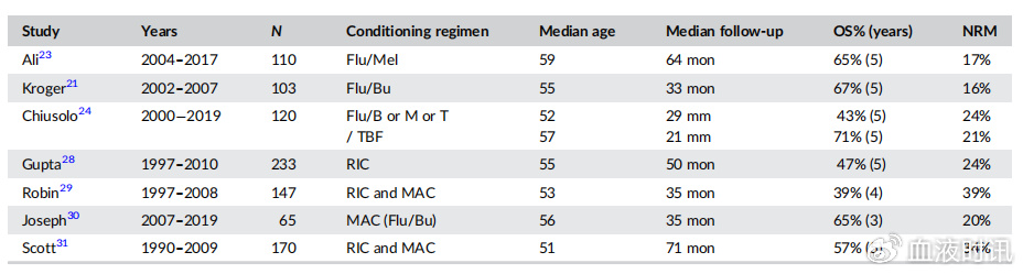 最常见的预处理方案为氟达拉滨+烷化剂(白消安、马法兰或噻替派中的一种),其中氟达拉滨剂量为120~1800 mg/m2。一项前瞻性随机研究比较了氟达拉滨+白消安 vs. 氟达拉滨+噻替派的疗效差异,结果显示:两组方案的NRM(非复发死亡率)、复发率及生存情况并无明显差异,然而移植后第100天时的混合嵌合的发生率在氟达拉滨+白消安组中明显高于氟达拉滨+噻替派组,为77% vs. 32(P=0.005),3年复发率均比较高,分别为36%和24%。近期有一项研究报道了110例MF患者接受氟达拉滨+马法兰预处理治疗的疗效,结果显示,中位随访64个月,5年OS为65%。值得注意的是,有研究表明,两种烷化剂的联合应用可提升移植后前几个月的完全嵌合状态的患者比例,并且可显著降低复发率。在一项研究中显示:①氟达拉滨+白消安+噻替派(TBF)能使87%达到完全供者嵌合,而氟达拉滨+白消安、氟达拉滨+噻替派或氟达拉滨+马法兰均只有45%,5年复发率分别为9%(氟达拉滨+白消安+噻替派)vs 43%(上述两药联合方案)。②5年无病生存率(DFS)分别为63% vs 43%,NRM两组基本相当。