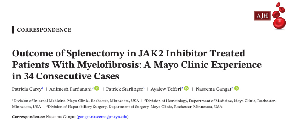 编者按:骨髓纤维化(MF)是一种以脾脏肿大和骨髓功能衰竭为特征的骨髓增殖性肿瘤。JAK2V617F突变的发现和JAK2抑制剂(JAKi)的开发彻底改变了MF的治疗格局。然而,JAKi治疗的益处通常是短暂的,许多患者最终会因耐药而停药。为此,梅奥诊所Naseema Gangat教授等探讨了脾切除术在JAK2抑制剂治疗的骨髓纤维化患者中的应用,并于近期发表于American Journal of Hematology。本文特整理研究主要内容,以飨读者。