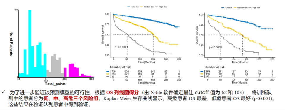 在单变量和多变量分析中应用了Cox回归模型,对生存相关因素进行了分析,结果显示,年龄、性别、分级、Ann Arbor分期、原发部位和放射治疗均为独立的预后因素(P<0.05)。进一步地,基于多变量分析的结果,构建了1年、5年和10年OS以及DSS的列线图。根据OS列线图生成的得分,将患者分为低风险、中风险和高风险组。这些结果不仅有助于识别高危患者,也为进一步筛选患者和制定个体化治疗方案提供了重要依据。