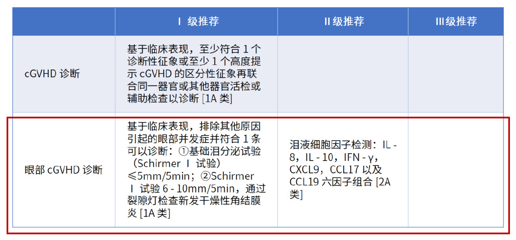 在cGVHD的诊断中,新增“眼部GVHD诊断内容”,见下表。