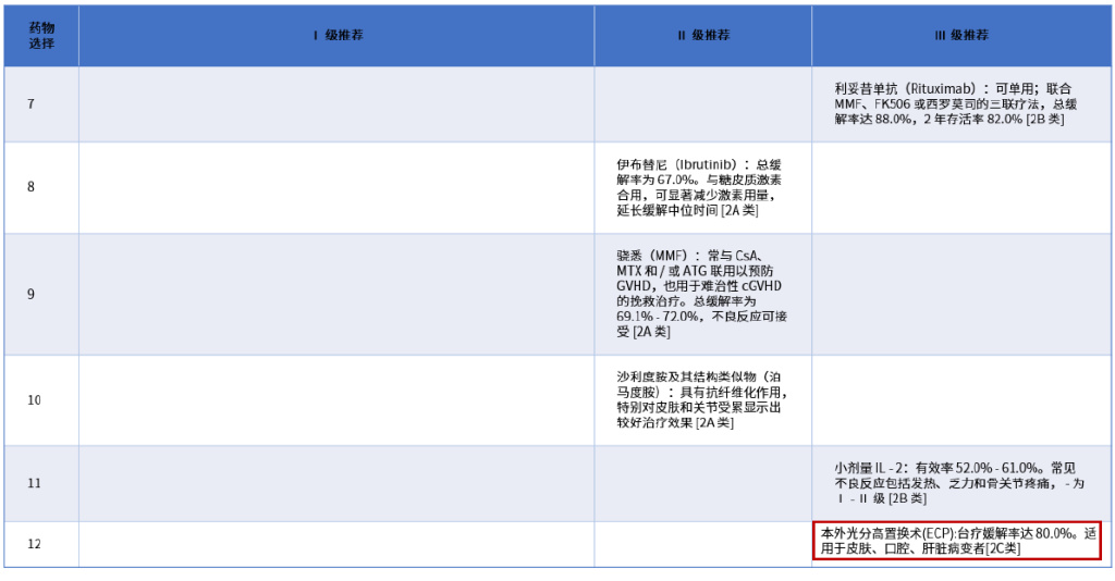 在cGVHD二线治疗的Ⅰ级推荐中增加“甲磺酸贝舒地尔(2A类)”,Ⅱ级推荐中增加“西罗莫司(2A类)”和“艾克利单抗(2A类)”,Ⅲ级推荐中增加“本外光分高置换术(ECP)(2C类)”,见下表。