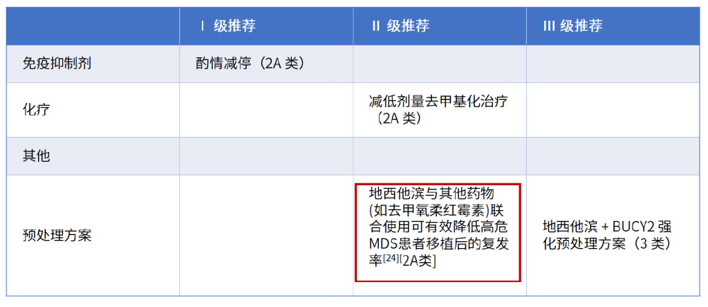 针对MDS移植后复发的预防,在预处理方案中,新增“地西他滨与其他药物(如去甲氧柔红霉素)联合使用可有效降低高危MDS患者移植后的复发率(2A类)”的Ⅱ级推荐,见下表。