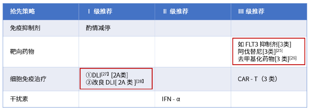 针对AML移植后复发的抢先治疗,在靶向药物的Ⅲ级推荐中新增“阿伐替尼(3类)”和“去甲基化药物(3类)”;在细胞免疫治疗的I级推荐中新增“改良DLI(2A类)”,见下表。