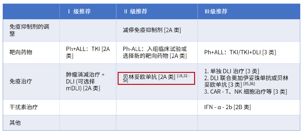 针对ALL移植后复发的抢先治疗,在免疫治疗的Ⅱ级推荐中新增“贝林妥欧单抗(2A类)”,见下表。