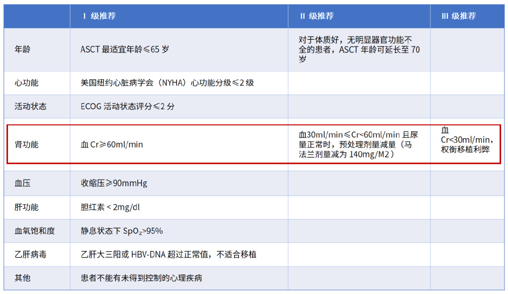 针对多发性骨髓瘤自体造血干细胞移植的适应证,将肾功能评估I级推荐中的“血30ml/min≤Cr<60ml/min且尿量正常时,预处理剂量减量(马法兰剂量减为140mg/M2)”和“血Cr<30ml/min,权衡移植利弊”分别调整为Ⅱ级、Ⅲ级推荐,见下表。