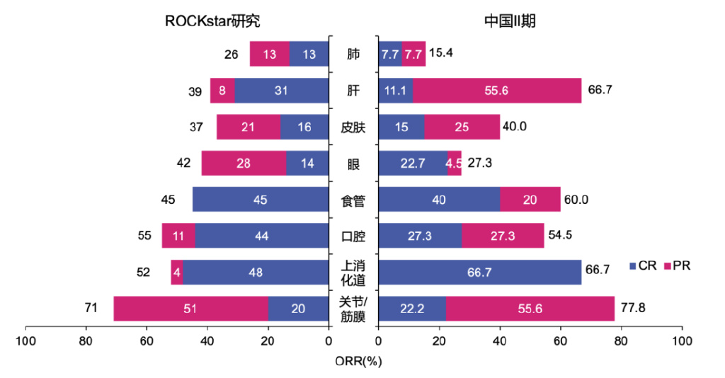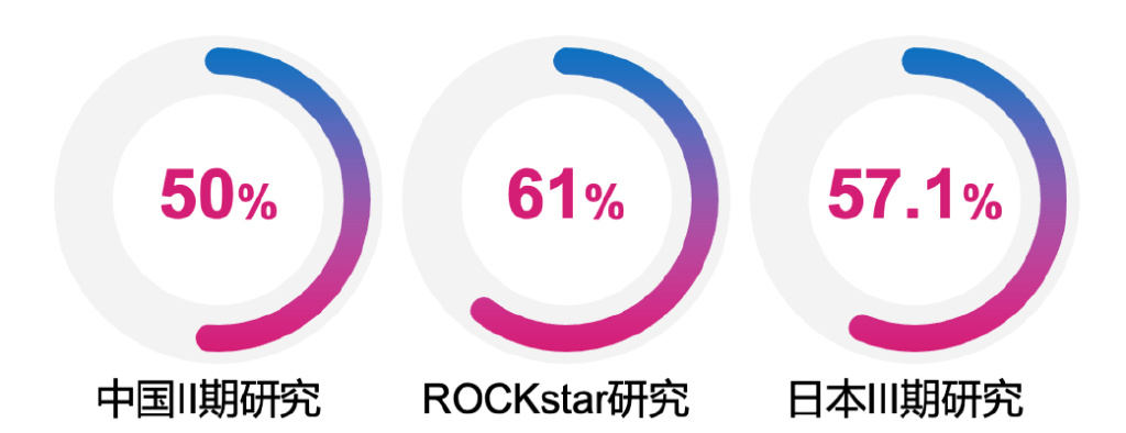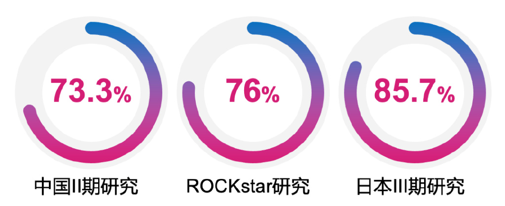 在诸多注册研究中,贝舒地尔展现了令人欣喜的疗效。ROCKstar研究11是一项随机、开放标签、国际多中心关键性II期研究(n=132),纳入了接受2-5线既往系统性治疗后出现持续活动性cGVHD表现的患者,98%患者为中重度,伴有多器官受累和纤维化表现,中位随访14个月。贝舒地尔中国II期研究(n=20)12的重度患者占比高达66.7%,中位随访12.9个月。日本III期研究(n=21)13,纳入既往系统治疗≤3线中重度cGVHD患者,中位随访9.9个月。三项研究中评估了贝舒地尔在cGVHD患者中的安全性、耐受性和有效性,主要结果如下: