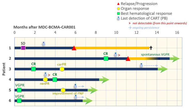 方法:本研究纳入了2022年12月至2024年3月期间,在德国海德堡大学医院治疗的6例患者(5例男性,1例女性)。这6例患者均接受固定剂量800×10⁶的BCMA靶向CAR-T细胞治疗。CAR-T细胞的单采、制备和回输均在内部完成。