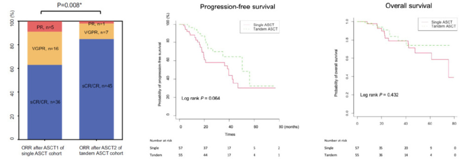 对于初治多发性骨髓瘤患者,现有研究表明:若患者在单次自体移植后已达到完全缓解(CR),后续再进行第二次移植并不能带来显著额外获益。而对于某些人群,如R-ISS分期为I期且无肾功能不全的患者,双次移植的疗效优于单次移植。这提示,在患者风险分层管理中,移植策略的选择需更加个体化。