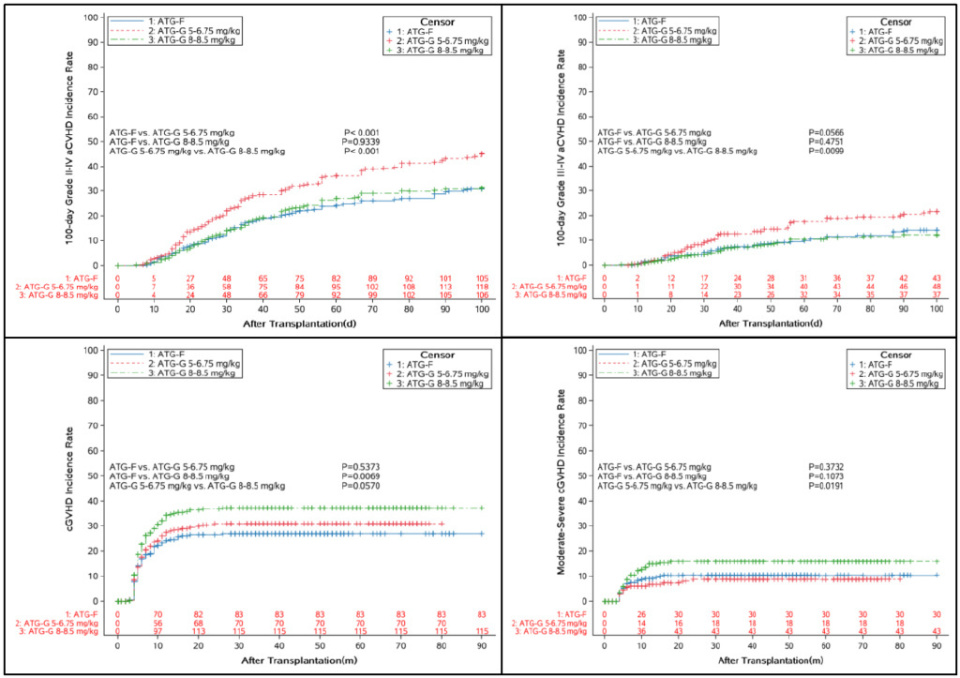 ATLG组II-IV级aGVHD的100天累积发生率低于ATG-T(5-6.75 mg/kg)组(18.2% vs .26.2%,P=0.113),但与ATG-T(7-8.5 mg/kg)组相似(18.2% vs .20.2%,P=0.496)。与ATG-T(5-6.75 mg/kg)组相比,ATLG组的100天累积III-IV级aGVHD发生率显著降低(12.6% vs. 18.2%,P=0.056),但与ATG-T(7-8.5 mg/kg)组相似(12.6% vs. 10.8%,P=0.475)。值得注意的是,ATG-T(5-6.75 mg/kg)组的III-IV级aGVHD发生率高于ATG-T(7-8.5 mg/kg)组(18.2% vs. 10.8%,P=0.009)。与ATG-T(7-8.5 mg/kg)组相比,ATLG组cGVHD的5年累积发生率也较低(24.4% vs. 33.8%,P=0.005),而中至重度cGVHD发生率相似[8.8% vs. 12.6%(95% CI:9.3-16.6);P=0.131)]。见图2。