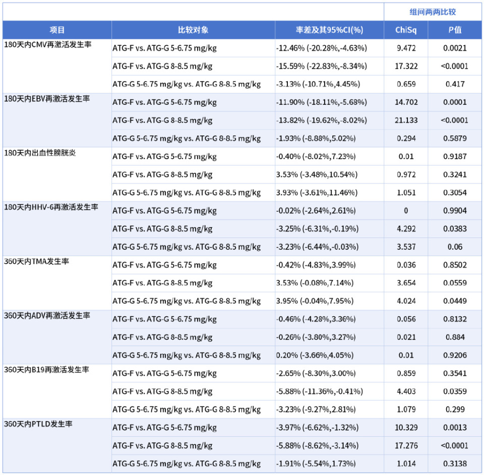 ATLG组180天CMV病毒血症(52.9% vs. 65.4% vs. 68.5%,P<0.0001)、180天EBV病毒血症(12.0% vs. 23.9% vs. 25.8%,P<0.0001)、360天移植后淋巴细胞增生性疾病(PTLD)(0.59% vs. 4.56% vs. 6.47%,P=0.003)和360天HHV-6再激活(0.59% vs. 4.5% vs. 6.4%,P<0.0001)的发生率明显低于ATG-T(5-6.75 mg/kg)和ATG-T(7-8.5 mg/kg)组,但是在不同剂量ATG-T(5-6.75 mg/kg)和ATG-T(7-8.5 mg/kg)组间并无统计学差异。在360天的出血性膀胱炎、细小病毒再激活、腺病毒再激活或移植相关血栓性微血管病(TA-TMA)发生率方面,三组间无显著统计学差异。见表1。