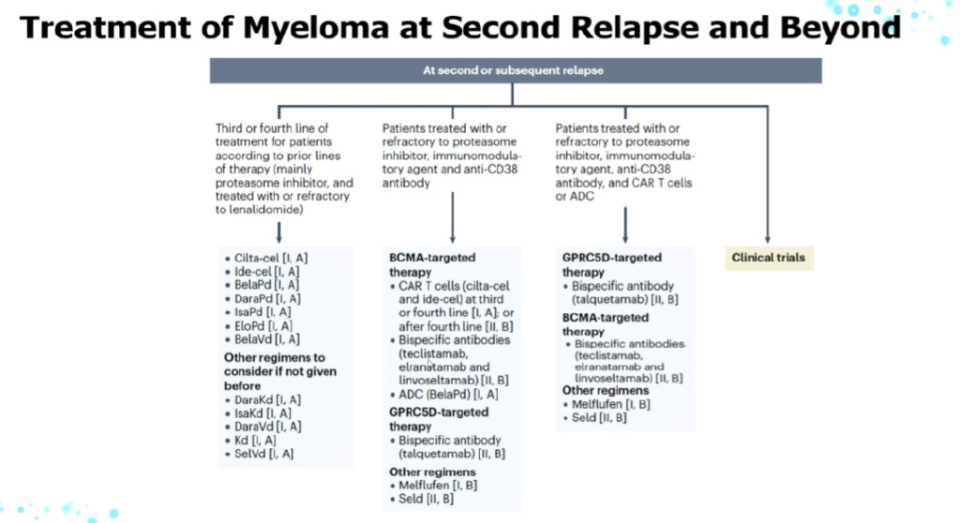 Therefore, clinicians should view these guidelines as a foundational framework—an initial reference point that must be adapted to the specific characteristics of the patient in front of them. One particularly complex aspect is the sequencing of BCMA-targeted therapies. As mentioned, we now have two CAR-T cell products, three bispecific antibodies targeting BCMA, and one BCMA-directed antibody-drug conjugate (ADC), Belantamab mafodotin.