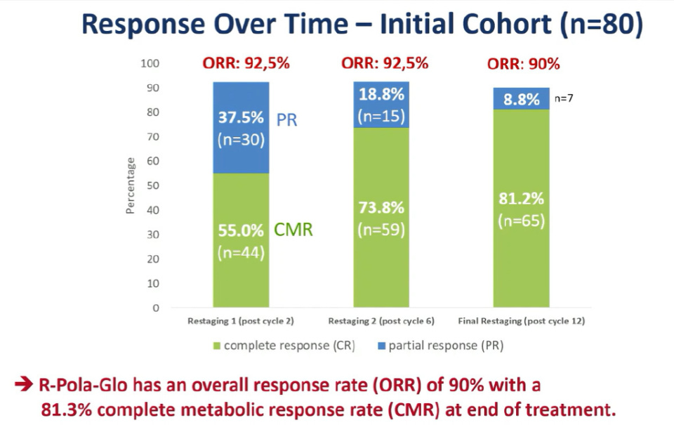 R-Pola-Glo试验显示,EOT时ORR达90%,CMR达82%,并且在后续巩固治疗阶段仍有约半数患者从PR转化到CMR,展现了卓越的深度缓解能力,有望成为不适合足量R-CHOP的初治侵袭性淋巴瘤患者的一线选择;