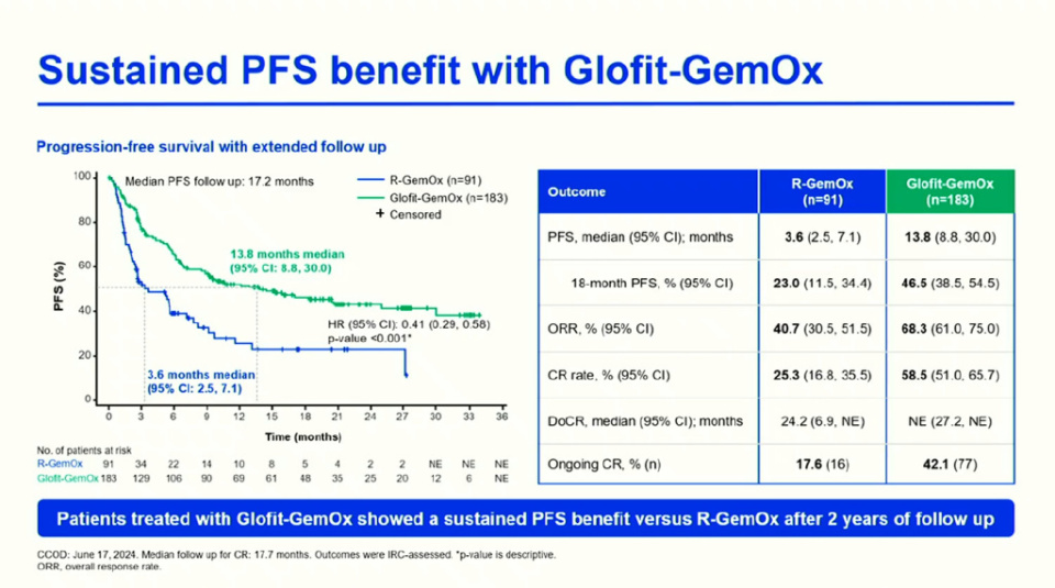 III期STARGLO试验2年随访数据显示,固定疗程Glofit-GemOx方案中位PFS达13.8个月,CR率跃升至58.5%;并且EOT时达到CR的患者,EOT后1年大多数患者仍维持缓解;在2L患者亚组中,Glofit-GemOx方案18个月PFS率达52.2%,24个月OS率高达59.9%(vs 38.9%);支持早期将其作为不符合移植条件的R/R DLBCL患者的优选现货型疗法;