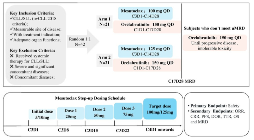 患者按年龄与TP53突变/del(17p)状态分层,1:1随机接受Mesutoclax 100 mg或125 mg(第3-14周期每日一次),此前接受2个周期的奥布替尼诱导治疗(第1-17周期每日150 mg)。Mesutoclax采用为期5周的剂量递增方案(5/10 mg、25 mg、50 mg、75 mg、100/125 mg),以降低肿瘤溶解综合征(TLS)风险。若患者在第17周期达到MRD阴性(uMRD,<10-4),则可停止奥布替尼治疗。主要终点为安全性,次要终点包括总缓解率(ORR)、无进展生存期(PFS)、缓解持续时间(DOR)以及基于流式和NGS的外周血(PB)与骨髓(BM)MRD检测(PB:联合治疗达到目标剂量后每12周检测;PB+BM:联合治疗结束后第12和48周检测)。