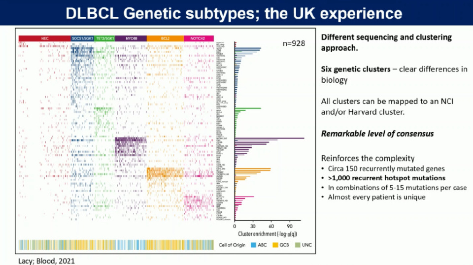 Hartson教授指出,DLBCL在基因层面并非单一疾病,而是由多种疾病构成的复杂综合体。通过回顾多项里程碑式的外显子组测序研究,他强调了DLBCL基因谱的高度复杂性与异质性。“我们讨论的不仅仅是单个基因突变,DLBCL中约有150个反复突变的基因,超过1000种反复出现的具体突变位点,并且每个患者体内通常携带5至15个驱动突变的组合。” 这种“千人千面”的基因特征意味着几乎每位患者的肿瘤都是独一无二的,这给理解突变功能及制定有效治疗策略带来了巨大挑战。