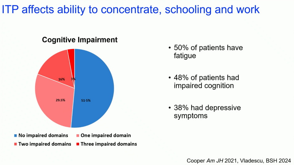长期以来,临床对ITP的关注点主要集中在血小板计数和出血风险上。然而,Cooper教授团队的研究揭示了该疾病远超于此的沉重负担。数据显示,超过50%的ITP患者饱受疲劳困扰,这往往是他们感受最重的症状。 同时,高达50%的患者表现出认知功能受损,影响其专注力和任务执行能力,进而导致学业和工作受阻。 更令人警醒的是,约40%的患者存在抑郁症状,而这一问题在临床实践中常被忽视。