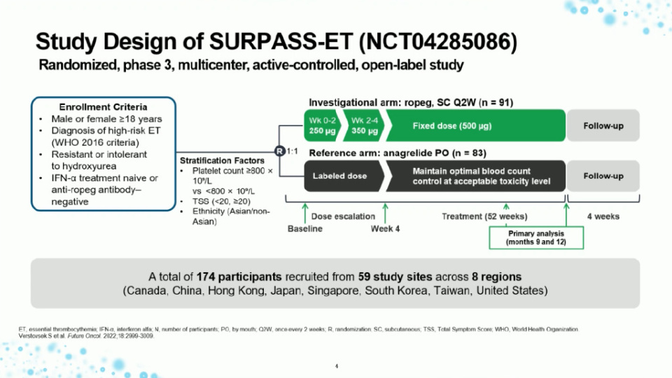 SURPASS-ET是一项随机、开放标签、多中心的III期临床试验,旨在直接比较Ropeginterferon与阿那格雷在高危ET患者中的疗效与安全性。研究共纳入174名对羟基脲不耐受或抵抗的成年高危ET患者,这些患者既往未接受过干扰素α治疗或经检测无抗Ropeginterferon抗体。