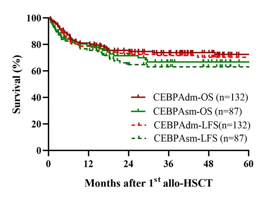 在219例CEBPAmu患者中,132例(60.3%)为CEBPAdm,87例(39.7%)为CEBPAsm。CEBPAdm组的5年OS(72.5% vs 66.9%, P=0.38)和LFS(70.4% vs 63.2%, P=0.17)略高,但无统计学显著性。同样,CEBPAdm组的5年NRM(20.7% vs 24.6%, P=0.60)和CIR(10.5% vs 20.1%, P=0.09)较低,但差异也未达到统计学显著性。