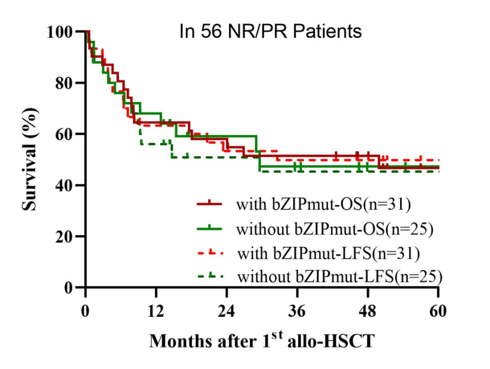 31例(55.4%)患者携带bZIP结构域受累突变,25例(44.6%)未受累。两组的5年OS(46.7% vs 47.3%, P=0.92)和LFS(49.8% vs 45.3%, P=0.55)相似。5年NRM(25.8% vs 31.8%, P=0.79)和CIR(26.9% vs 29.1%, p=0.51)也无显著差异。bZIP受累的CEBPAsm(n=9)与CEBPAdm(n=22)患者间的结局可比,且与无非bZIP受累患者(23例CEBPAsm和2例CEBPAdm)相似。然而,所有NR/PR亚组患者的移植后结局均显著差于其对应的CR亚组(所有P<0.05)。