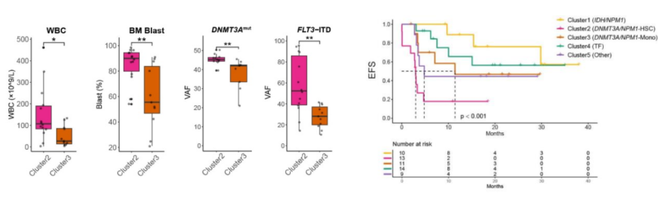 研究发现,不同起源亚型的预后截然不同,这为精准分层提供了全新的视角。在四种亚型中,DNMT3A/NPM1 起源的患者预后最差,这与既往的研究报道一致。但该克隆起源的患者仍具有一定的异质性,其内部根据细胞分化状态进一步分为“造血干细胞(HSC)样”和“单核细胞(Mono)样”两个亚群。其中,呈现 HSC 表达特征的患者初诊时肿瘤负荷更高,无病生存(EFS)显著缩短。