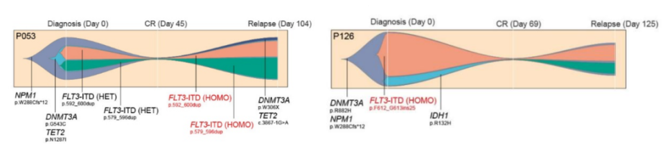 急性髓系白血病(AML)是一种高度异质性的恶性血液肿瘤。其中,携带 FLT3-ITD 突变的患者占比约 20%-30%。FLT3-ITD是AML的重要驱动突变,在AML发病过程中常作为晚期突变事件,常与NPM1、DNMT3A、WT1等突变共存。尽管该突变通常预示预后不良,但临床观察发现,不同 FLT3-ITD+ 患者的生存结局存在巨大差异。以往研究多关注FLT3-ITD本身的分子特征,但其克隆起源对预后的影响常被忽视。此外,从初治到难治/复发(R/R)过程中,驱动耐药的关键遗传学演化规律仍待挖掘。