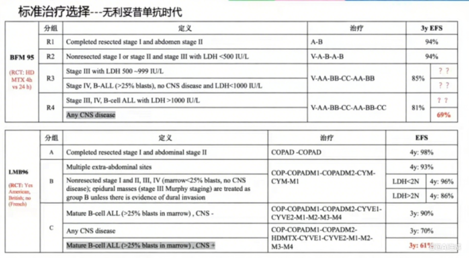 为应对挑战,当前优化策略主要体现在“减毒增效”与“精准强化”两个方向。一方面,国际研究通过联合CD20单抗,成功降低了特定风险组的化疗强度而未影响疗效。另一方面,针对既往疗效不理想的高危亚组,最新研究致力于通过优化利妥昔单抗的使用策略实现突破。例如,正在开展的CCCG-BNHL-2025研究进行了关键调整:扩大高危组(R4组)范围,将Ⅲ期且LDH处于2-4倍正常上限的病例纳入;增加利妥昔单抗总剂次至6剂,并在关键的第1、2疗程密集使用;对极端高危患者进一步增加化疗疗程。该研究目标是将这部分高危患者的3年无事件生存率从70%提升至90%,代表了通过“靶向药物精准强化”来突破疗效瓶颈的前沿探索。