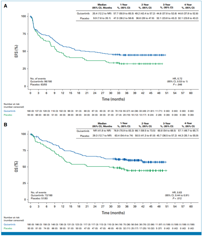 基于此发现,研究者进一步开展了II期QUIWI研究,并观察到了显著的治疗获益和持续的疾病控制优势:奎扎替尼组和安慰剂组的中位无事件生存(EFS)分别为20.4个月和9.9个月,奎扎替尼组的中位OS尚未达到,3年OS率为60.8%(安慰剂组mEFS 29.3个月,HR = 0.63;3年OS率45.7%)。