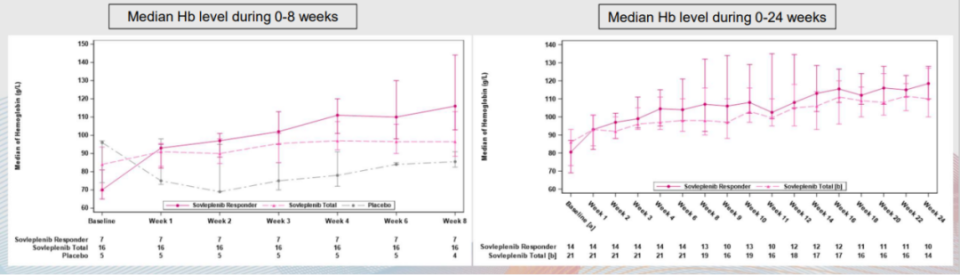 在治疗起效时间方面,在起始就接受索乐匹尼布治疗的患者中,Hb水平较基线增加≥15 g/L的中位时间为1.3周。在整体患者人群中,接受索乐匹尼布治疗的患者达到Hb≥100 g/L,并且较基线增加≥20 g/L的中位时间为4.9周。此外,在持续缓解的作用方面,根据24周研究数据,索乐匹尼布治疗的中位缓解持续时间达到20.5周。