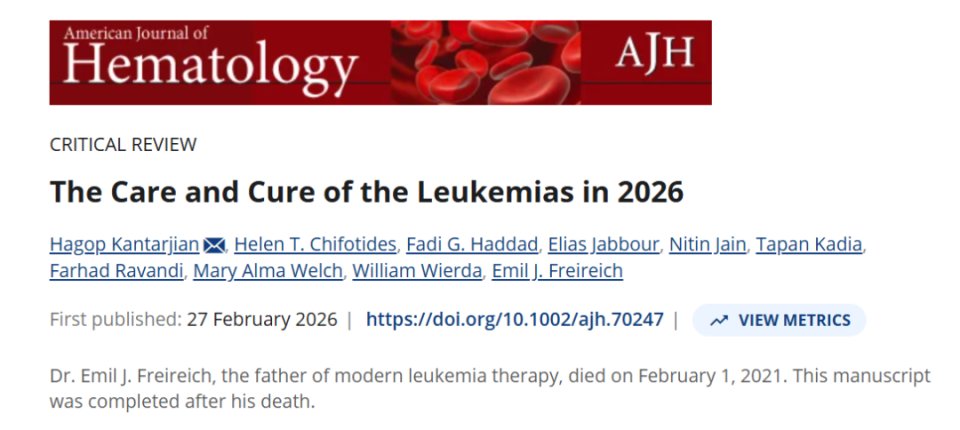 Kantarjian H, Chifotides HT, Haddad FG, Jabbour E, Jain N, Kadia T, Ravandi F, Welch MA, Wierda W, Freireich EJ. The Care and Cure of the Leukemias in 2026. Am J Hematol. 2026 Feb 27. doi: 10.1002/ajh.70247. Epub ahead of print. PMID: 41761287.