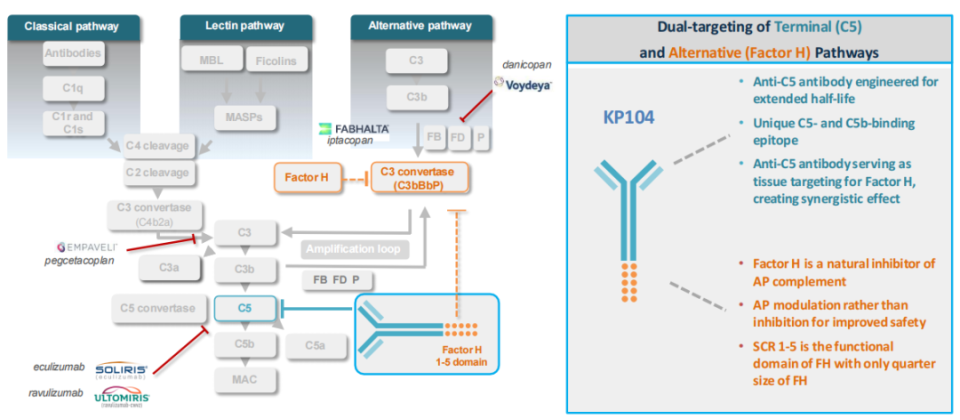 阵发性睡眠性血红蛋白尿症(PNH)是一种罕见且危及生命的血液系统疾病,其特征为受累血细胞表面补体调控失衡,导致血管内溶血(IVH)和血管外溶血(EVH)。KP104是一种新型双功能重组蛋白药物,由人源化抗C5单克隆抗体与补体因子H的调控结构域融合而成,可同时抑制末端和近端补体通路。