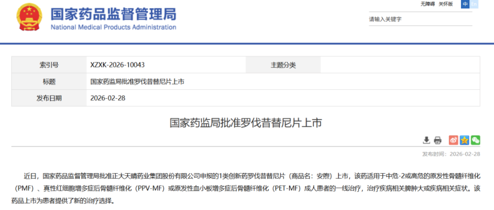 2026年2月28日,中国国家药品监督管理局(NMPA)正式批准正大天晴自主研发的全球首创口服JAK1/2+ROCK1/2双通路抑制剂——罗伐昔替尼(安煦®)在国内上市,适用于中危-2或高危的原发性骨髓纤维化(PMF)、真性红细胞增多症后骨髓纤维化(PPV-MF)或原发性血小板增多症后骨髓纤维化(PET-MF)成人患者的一线治疗,治疗疾病相关脾肿大或疾病相关症状1。该获批主要基于其关键临床研究2-3,数据显示罗伐昔替尼可显著改善患者脾脏体积和症状评分,且安全性良好。作为双靶点MF治疗药物,罗伐昔替尼以“抗炎+控纤”双重机制突破现有治疗局限,既彰显了我国民族药企的研发实力,更推动MF领域正式迈入双靶精准治疗新时代。