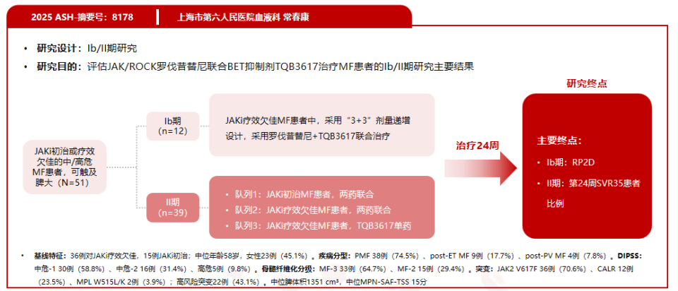 在上海市第六人民医院常春康教授牵头开展的Ib/II期联合治疗研究(NCT06122831)中,罗伐昔替尼与BET抑制剂TQB3617联合用于JAK抑制剂(JAKi)初治或疗效欠佳的中/高危MF患者,取得了颇具前景的结果23。Ib期研究显示,推荐剂量下未发生剂量限制性毒性,24周SVR35率达50%,TSS50率67%,92%的患者血红蛋白水平提升≥15g/L,45%的患者骨髓纤维化等级改善,JAK2V617F等位基因负荷下降40%。Ⅱ期研究中,24周SVR35率高达91.67%,TSS50率达100%;整体安全性优异,≥3级治疗相关不良事件发生率仅29.4%,主要为血小板减少(13.7%)和贫血(5.9%),无治疗相关死亡,为MF患者提供了积极的治疗路径。