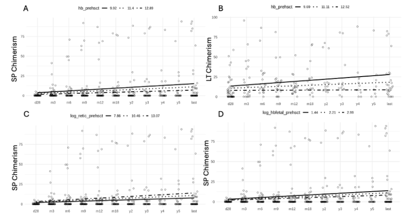 西班牙马德里Gregorio Marañón医院的Teresa Martin Alaez带来了“镰状细胞病造血干细胞移植中可能影响嵌合状态的因素评估”(OS05-06)。 本研究旨在确定与镰状细胞病患者移植后获得并维持完全供者嵌合(CC)相关的因素。该单中心分析纳入了62名患者进行的63例HLA相合同胞供者移植。中位随访结束时,65.1%的患者维持完全嵌合。分析发现,移植前较高的血红蛋白水平与最后一次随访时获得完全嵌合显著相关,而较高的网织红细胞计数则与较差的嵌合状态相关。混合效应模型进一步证实,移植前较高的血红蛋白水平与更长随访时间内,外周血和T淋巴细胞中供者嵌合度的进行性下降相关。研究强调,充分的移植前准备(通过输血和羟基脲控制血红蛋白和网织红细胞计数)对于获得良好的长期嵌合状态至关重要。