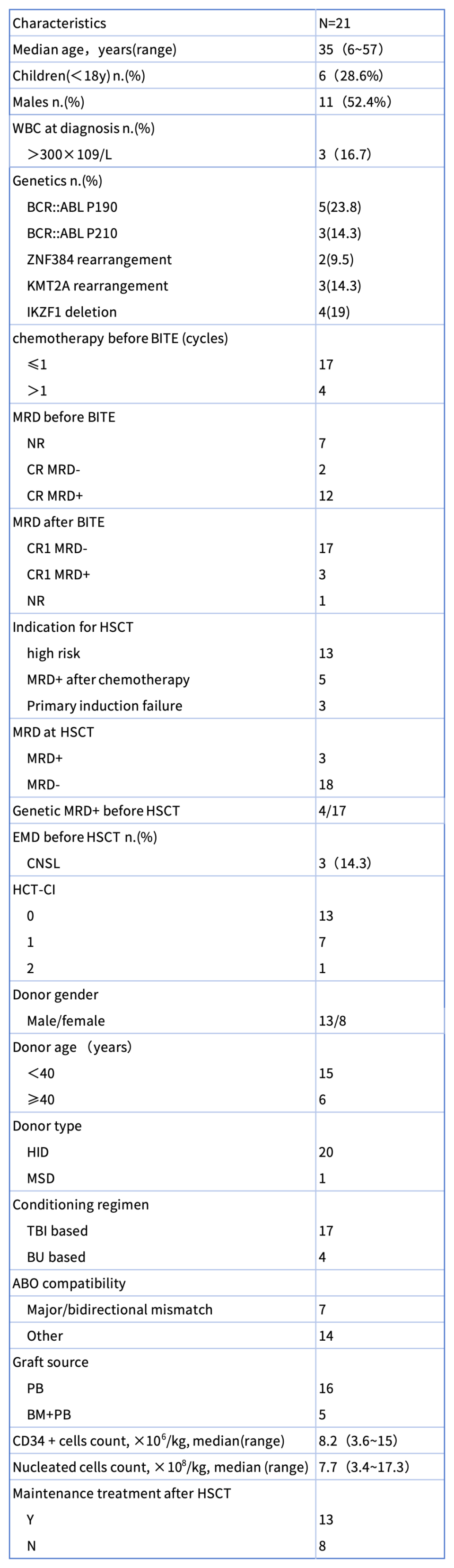 总共入组21例新诊断的急性白血病患者,包括两例急性混合细胞白血病(MPAL,B/髓),19例B-ALL,其中两例为慢性粒细胞白血病(CML)转化。病例基础特征见表1。中位年龄35(6-57)岁,11例男性(52.4%),6例儿童患者(28.6%)。诊断的时候有3例患者白细胞>300×109/L。6例儿童患者中2例中危,4例高危。15例成人患者中6例标危9例高危。13例患者应用BLIN作为诱导治疗,8例作为巩固治疗。