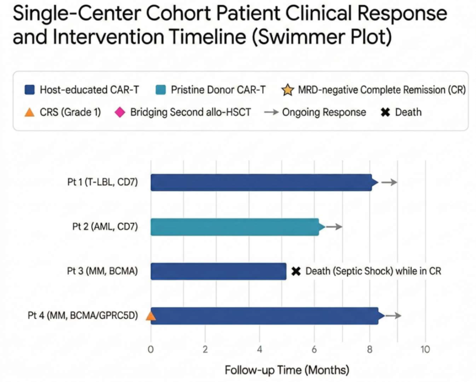 其中,3例患者接受由移植后外周血制备的CAR-T细胞(功能上属于“受者环境教育后”的供者来源细胞):2例多发性骨髓瘤患者分别接受BCMA靶向CAR-T(1例)或序贯BCMA/GPRC5D双靶CAR-T(1例),1例T-LBL患者接受CD7靶向CAR-T。第4例患者(伴异常CD7表达的AML)接受由原始健康半相合供者制备的CD7 CAR-T。所有患者CAR-T输注前均接受氟达拉滨联合环磷酰胺进行淋巴细胞清除预处理。疗效评估依据IMWG或ELN标准。本研究经机构伦理委员会批准(ChiCTR1900025419)。