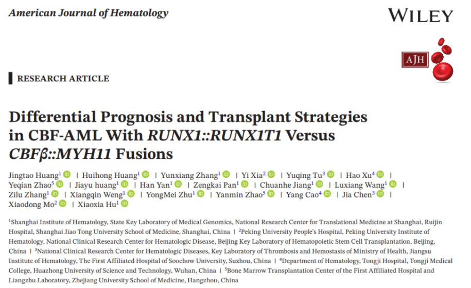为探索这一问题,由上海瑞金医院、浙江大学附属第一医院、武汉同济医院、北京大学人民医院及苏州大学附属第一医院共同开展了一项多中心回顾性研究。该研究结果部分印证了既往的临床观察,但也揭示了新的规律。与以往认知一致的是,伴有CBFβ::MYH11融合基因的患者,其移植后早期死亡率确实高于RUNX1::RUNX1T1融合基因患者,但这一早期风险的增加并未转化为总生存率的差异。